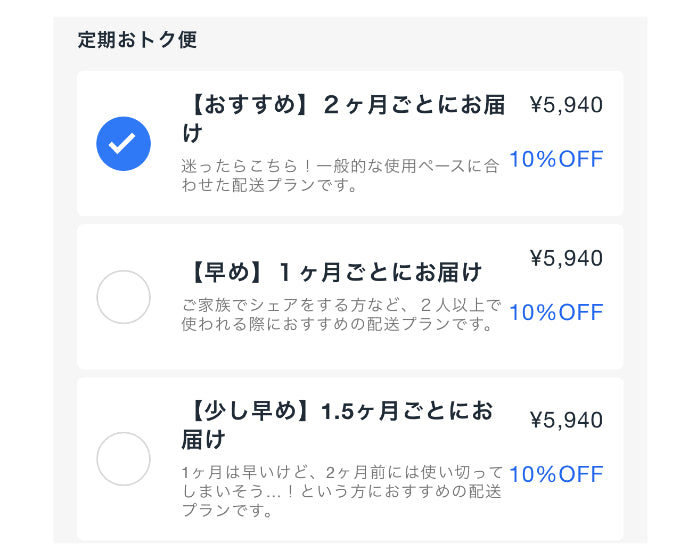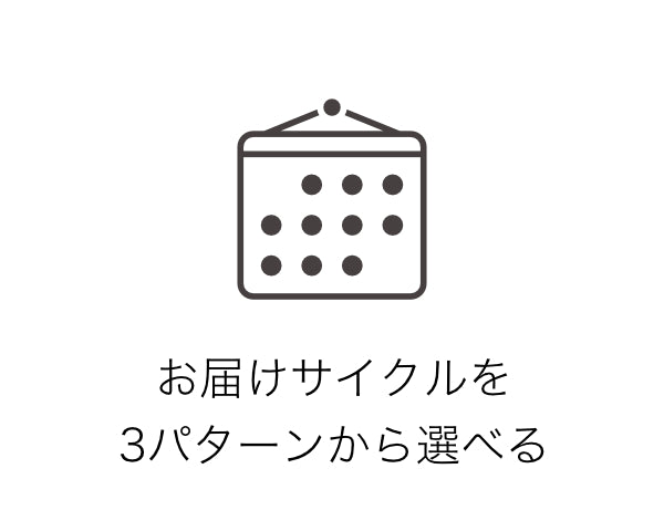 1ヶ月半、2ヶ月、3ヶ月の3パターンからお届けサイクルを自由に選べます。使い方に合わせて選べるため無駄がなくなります。